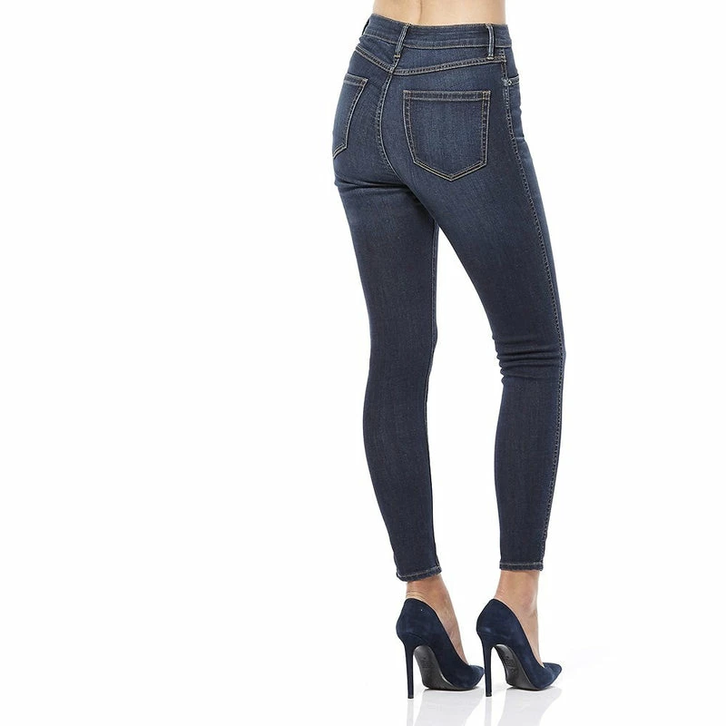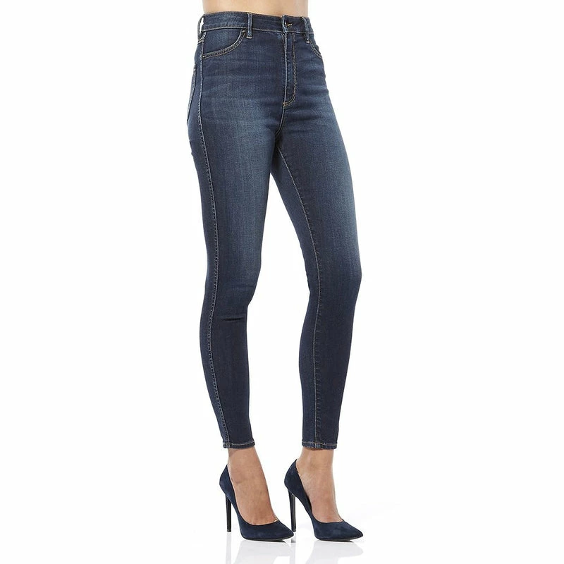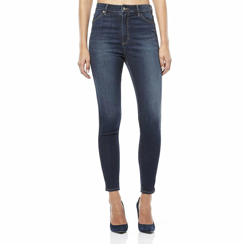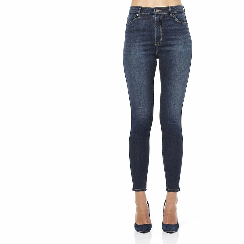 - Hi rise skinny fit with a a traditional dark blue wash, thigh brushing, whiskers and contrast wheat stitch colour