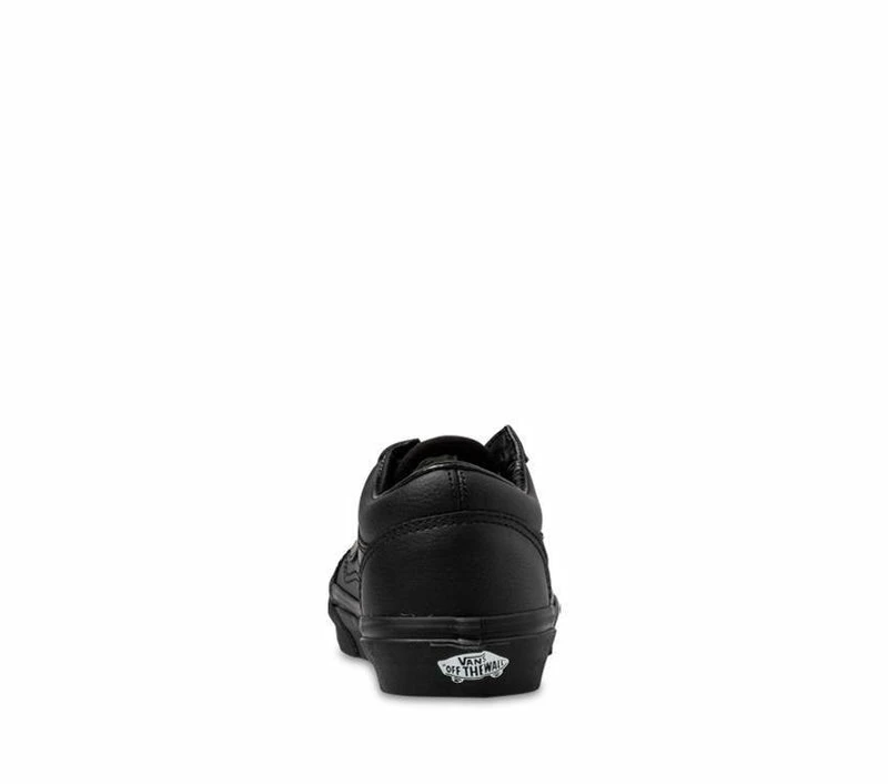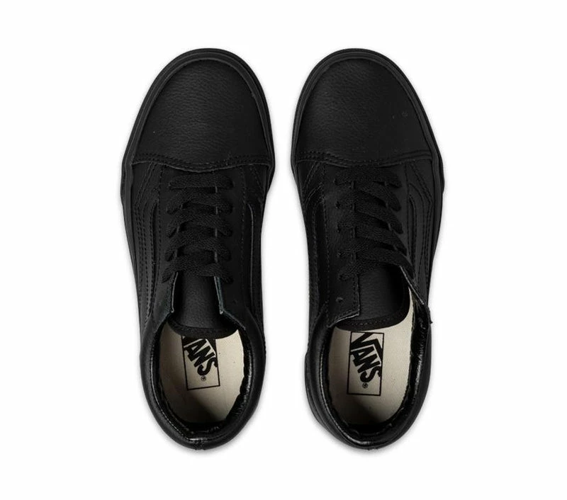 The Old Skool, the Vans classic skate shoe and first to bare the iconic sidestripe, is a low top lace-up for everyday use or for school. It features padded collars for support and flexibility, and the signature rubber waffle outsoles. Black on black leather shoe perfect for school.